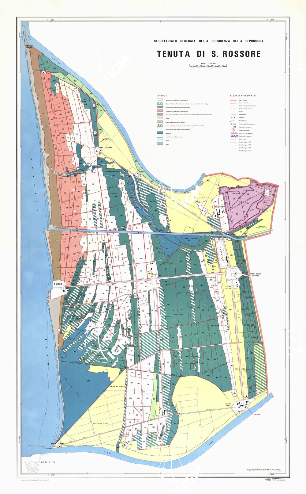 Carta allestita dall’ E.I.R.A. su base catastale nel 1959 aggiornata con rilievi diretti del 1971 e 1984 stampata dall’ IGM nel 1985 per il Segretariato Generale della Presidenza della Repubblica.