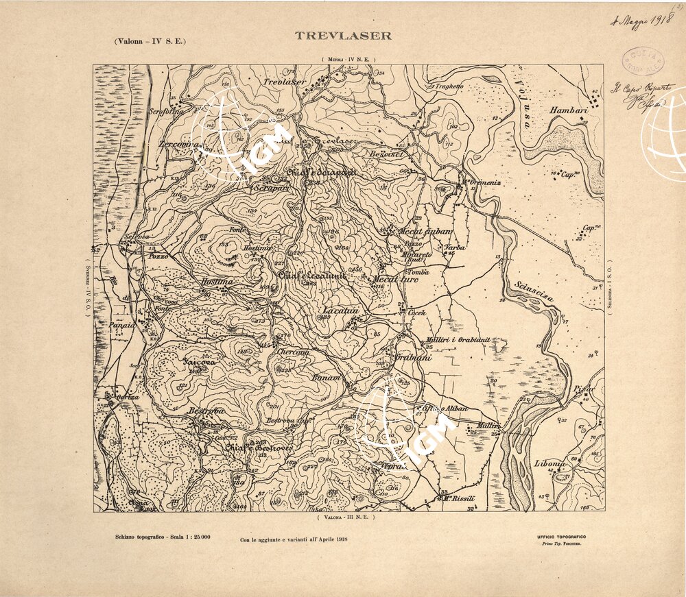 Carta ricavata mediante ingrandimento fotomeccanico dai rilievi alla scala di 1:50.000 dalla Sezione Cartografica del Comando XVI Corpo d’ Armata in Albania.