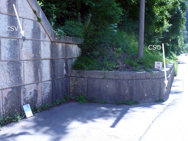 [{"simbolo_contrassegno":"B1","materializzazione":"(CSO) – Bullone infisso alla fine del muro di sostegno lato destro della S.S.203, in direzione Agordo, al km 14.400, subito prima della centrale ENEL."},{"simbolo_contrassegno":"V1","materializzazione":"(CSV) – Mensola (ex UIMA n. 143V) infissa su alto paramento con rivestimento in sasso subito dopo il CSO."}]