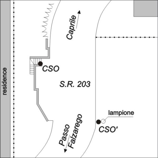 | Contrassegni | [{"simbolo_contrassegno":"B4","materializzazione":"(CSO) – Centrino Universale infisso sulla scala d'accesso al piazzale dei condomini, sulla sinistra della SR 203, in direzione Caprile."},{"simbolo_contrassegno":"B2","materializzazione":"(CSO) – Borchia (UIMA 179) infissa sul basamento del lampione, a destra della SR 203, 20 metri prima del CSO."}] |