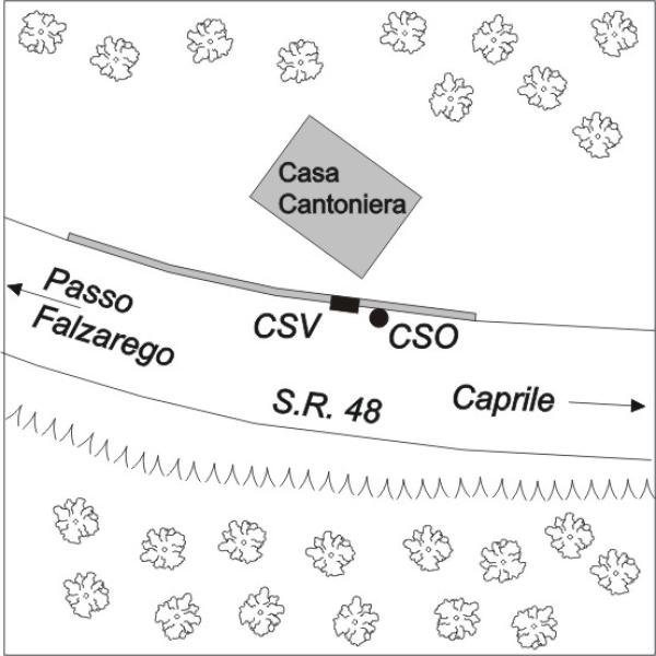 | Contrassegni | [{"simbolo_contrassegno":"B1","materializzazione":"(CSO) – Bullone infisso sulla parete di sostegno della casa cantoniera, a sinistra della SR 203, in direzione Caprile."},{"simbolo_contrassegno":"V1","materializzazione":"(CSV) – Mensola (UIMA 180) infissa sullo stesso muro di sostegno, in corrispondenza del CSO."}] |