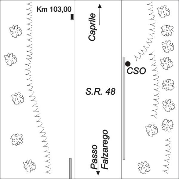 | Contrassegni | [{"simbolo_contrassegno":"B1","materializzazione":"(CSO) – Bullone infisso su muretto in c.a. a destra della SR 48 in direzione Caprile, prima del tornante n\u00b0 11."}] |