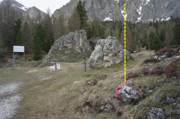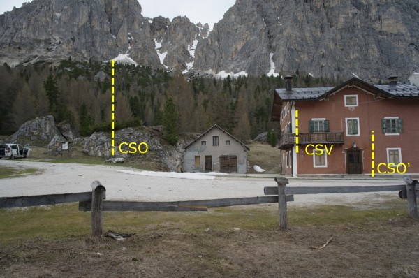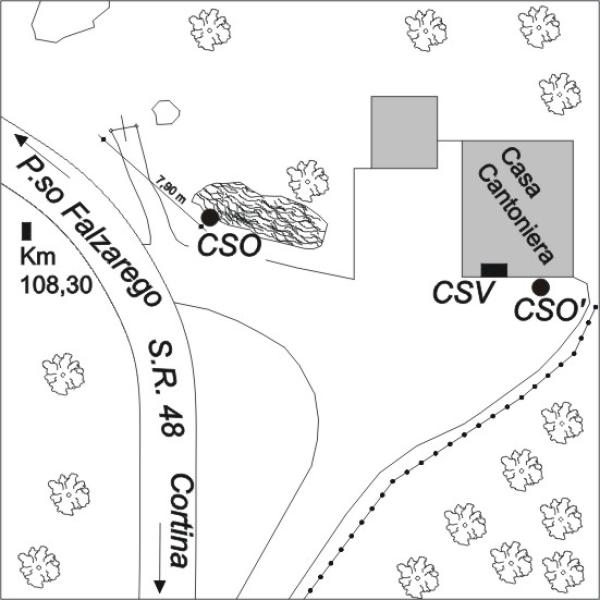 [{"simbolo_contrassegno":"B4","materializzazione":"(CSO) – Centrino Universale infisso su roccia affiorante nei pressi dell'accesso all'ex bar-ristorante, al civico 1, ed a 7,9 m dal palo destro del cancello che d\u00e0 accesso al Parco Naturale delle Dolomiti Ampezzane."},{"simbolo_contrassegno":"B2","materializzazione":"(CSO') – Borchia (UIMA 199) infissa a destra ed alla base dei gradini d'entrata all'ex bar-ristorante al civico 1."},{"simbolo_contrassegno":"V1","materializzazione":"(CSV) – Mensola (UIMA 199) infissa sulla facciata, angolo Sud-Est, dell'ex bar-ristorante al civico 1."}]