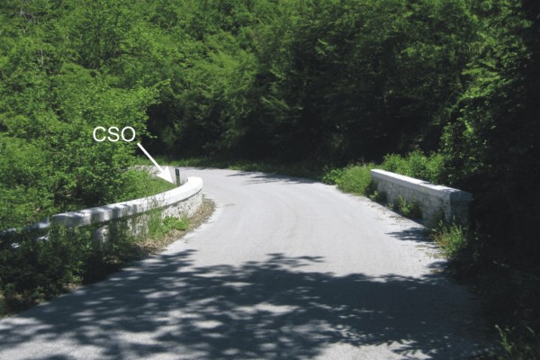 | Contrassegni | [{"simbolo_contrassegno":"B1","materializzazione":"(CSO) – Bullone infisso nel parapetto in pietra, lato valle, a metri 2,00 dalla testata, direzione San Chirico"}] |