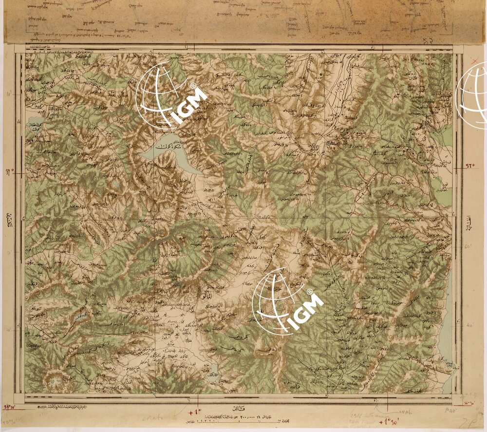 Carta Turca compilata negli anni dal 1909 al 1916 e stampata nella tipografia della sezione cartografica nel 1917 su alcuni fogli è sovrapposto un lucido con la traduzione Italiana della toponomastica.