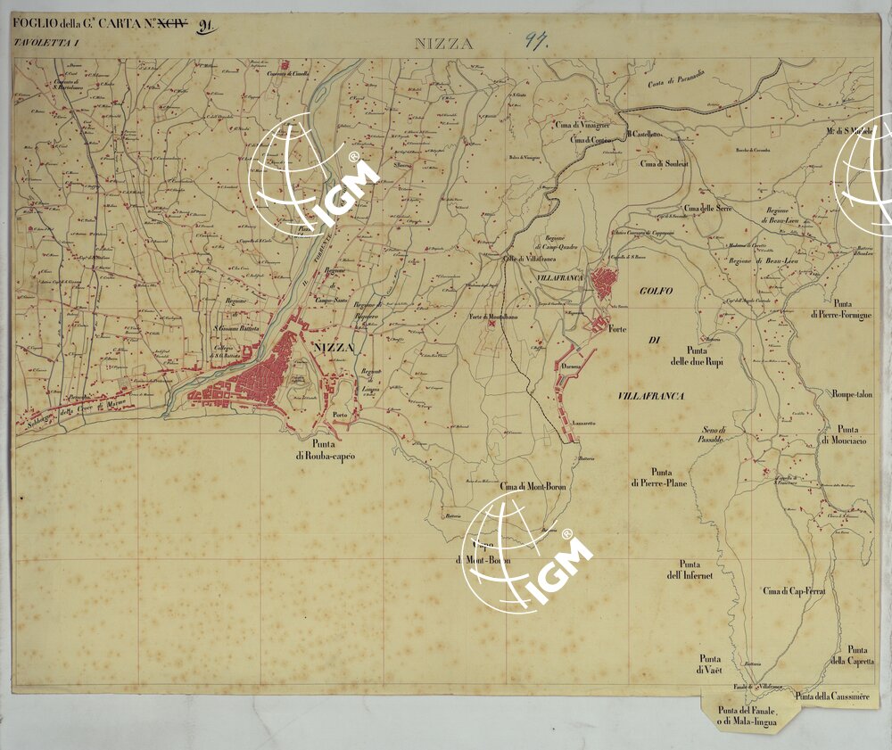 Rilievo regolare in 99 tavolette (minute di campagna) del territorio della Contea di Nizza. Il rilievo è dimostrato a curve orizzontali, tracciate all’equidistanza di 10 metri. Gli operatori furono ufficiali di armi diverse, probabilmente allievi della Scuola di S. M. : Avet, Albert, Borson, Basso, Bergalli, Costanze, Cordon, Ceva, Colli, Carderina, Cordero, Coda, Di Pralormo, Dal Pozzo, De Fornari, De Candia, D’Angennes, Escoffier, Federici, Falicon, Govone, La Grange, La Fleche, Muletti, Marazzano, Mazè, Morozzo, Mariani, Pictet, Ponzani, Piola Caselle, Righini, Rinaudo, Ricci, S. Andrea, Somis, Villamarina.