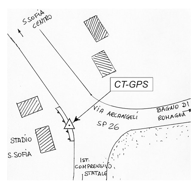 | Materializzazione | Centrino metallico infisso su muro in pietra, situato nei pressi dell'incrocio fra la S.P. 26 per Bagno di Romagna e la strada che conduce all'Istituto Comprensivo Statale. |