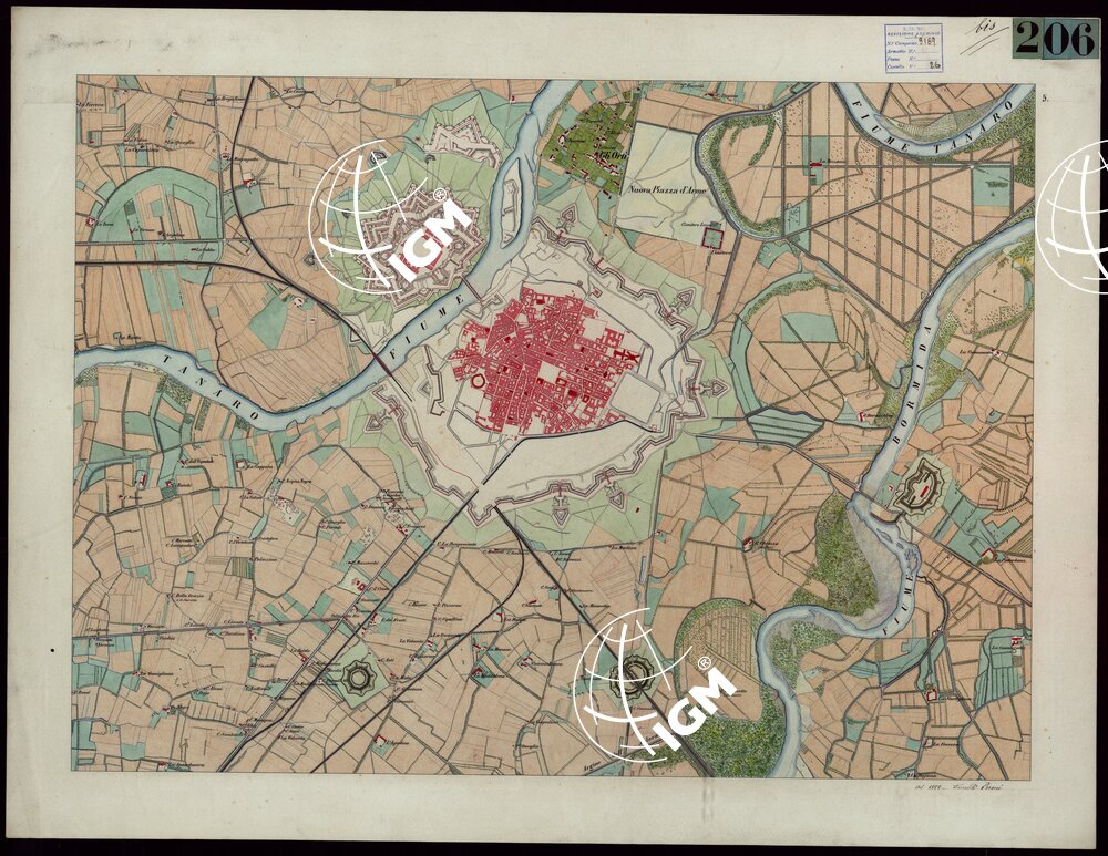 Il titolo non è presente sulla carta. Il Documento N° 206 bis consiste di copia, a colori, artisticamente eseguita nel 1858 dal Topografo Galante e dal Ten. Peroni di nove delle tavolette del documento N. 206.
