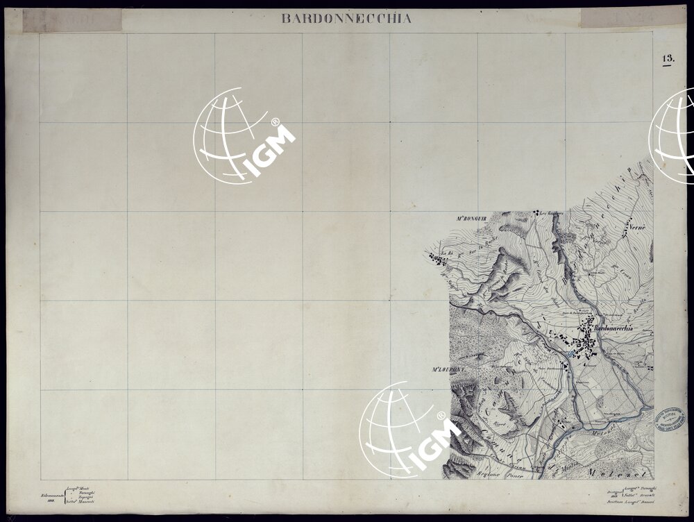 Trentatré minute di campagna montate su tela riconosciute sul terreno tra il 1861 ed il 1881. Il documento si completa con quattro quadri d’unione.