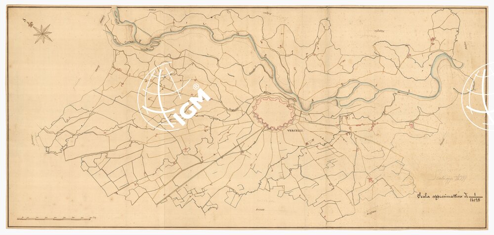 Il titolo non è presente sulla carta. Disegno a penna a più tinte, incompleto, in un sol foglio rappresentante il territorio di Vercelli. Scala grafica di trabucchi 800; senza data nè nome di autore. Si può ritenere dei primi del secolo XIX.