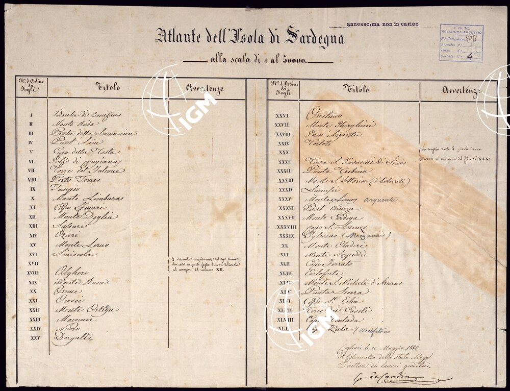 L’Atlante è stato realizzato dal Gen. De Candia utilizzando le riduzioni delle mappe catastali rilevate negli anni 1841-1847 che servirono per la realizzazione della Carta dell’Isola di Sardegna del Gen. La Marmora.