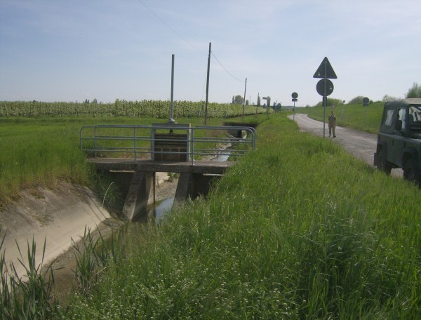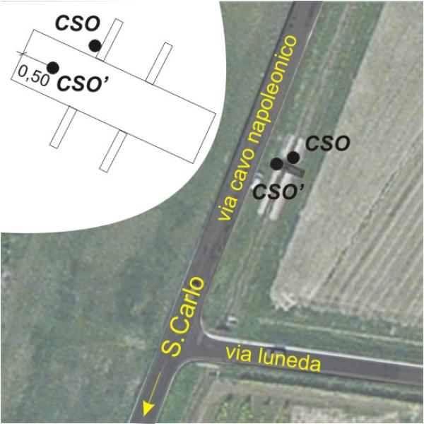 | Contrassegni | [{"simbolo_contrassegno":"B1","materializzazione":"(CSO) – Bullone infisso nel fianco lato valle della pila di riva sinistra della chiusa sul canale di scolo, presso l'incrocio con via Luneda."},{"simbolo_contrassegno":"B7","materializzazione":"(CSO') – Centrino Cispadana n.65 infisso sulla soletta della chiusa suddetta, a 50 cm dall'estremo lato strada."}] |
