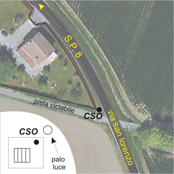 | Contrassegni | [{"simbolo_contrassegno":"B4","materializzazione":"(CSO) – Centrino universale infisso sul pozzetto di raccolta delle acque piovane, in via S.Lorenzo, all'incrocio con la pista ciclabile."}] |