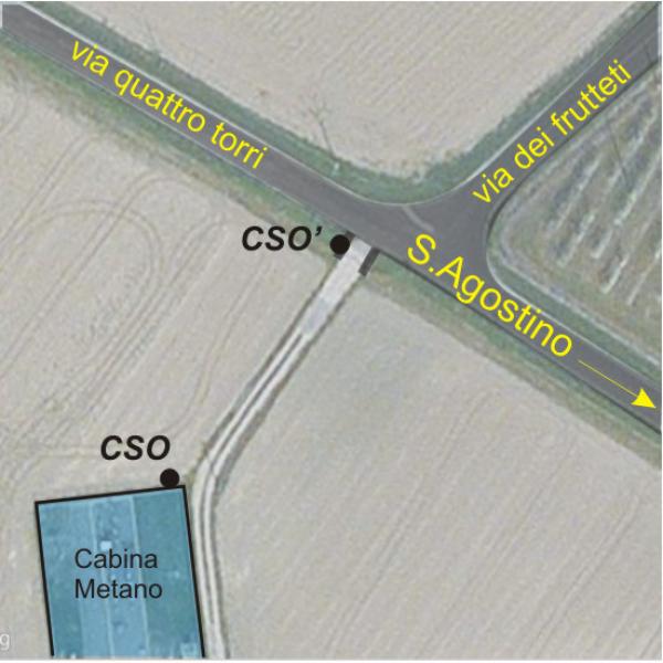 | Contrassegni | [{"simbolo_contrassegno":"B1","materializzazione":"(CSO) – Bullone infisso nel cordolo in c.l.s. della recinzione dell'impianto di riduzione pressione del metano, a 50 cm dallo spigolo rivolto a via Quattro Torri."},{"simbolo_contrassegno":"B7","materializzazione":"(CSO') – Centrino ARC V13 infisso sulla spalletta destra del ponticello di accesso all'impianto da via Quattro Torri."}] |