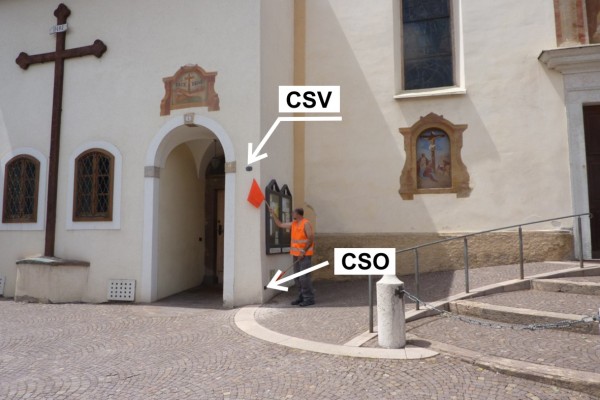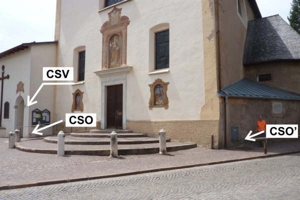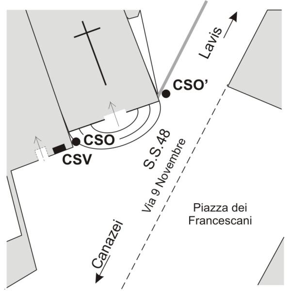 | Contrassegni | [{"simbolo_contrassegno":"B1","materializzazione":"(CSO) – Bullone infisso nella risega fra il convento dei Francescani e la Chiesa."},{"simbolo_contrassegno":"B1","materializzazione":"(CSO') – Bullone della Provincia Autonoma di Trento infisso nel lato della chiesa lungo la statale presso lo spigolo sinistro (necessita stadia da 2 metri)."},{"simbolo_contrassegno":"V6","materializzazione":"(CSV) – Piastrina con cilindretto murata sulla facciata a destra dell'ingresso al convento."}] |