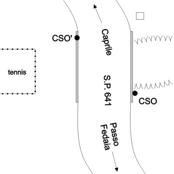 [{"simbolo_contrassegno":"B1","materializzazione":"(CSO) – Bullone infisso sul solettone, lato destro a valle, del ponte ad un centinaio di metri a nord della partenza della funivia per la Marmolada"},{"simbolo_contrassegno":"B4","materializzazione":"(CSO') – Centrino universale infisso sul solettone, lato destro a valle del ponte, ad un centinaio di metri a Nord della partenza della funivia per la Marmolada."}]