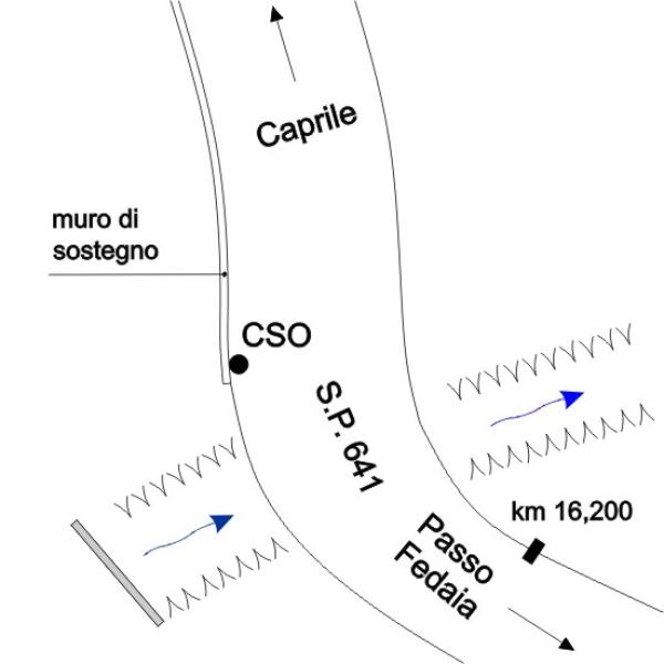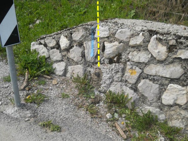 [{"simbolo_contrassegno":"B1","materializzazione":"(CSO) – Bullone infisso alla fine del muro di sostegno a destra della SP 641, in direzione Passo Fedaia"}]