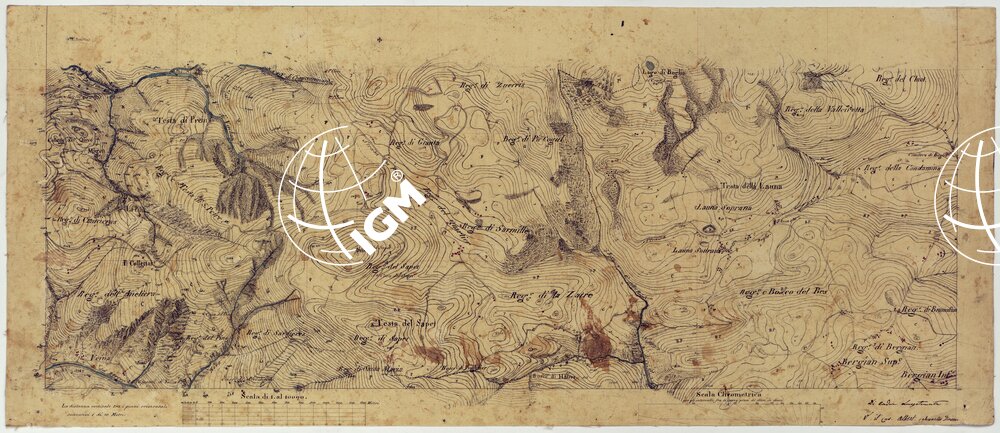 Rilievo regolare in 99 tavolette (minute di campagna) del territorio della Contea di Nizza. Il rilievo è dimostrato a curve orizzontali, tracciate all’equidistanza di 10 metri. Gli operatori furono ufficiali di armi diverse, probabilmente allievi della Scuola di S. M. : Avet, Albert, Borson, Basso, Bergalli, Costanze, Cordon, Ceva, Colli, Carderina, Cordero, Coda, Di Pralormo, Dal Pozzo, De Fornari, De Candia, D’Angennes, Escoffier, Federici, Falicon, Govone, La Grange, La Fleche, Muletti, Marazzano, Mazè, Morozzo, Mariani, Pictet, Ponzani, Piola Caselle, Righini, Rinaudo, Ricci, S. Andrea, Somis, Villamarina.