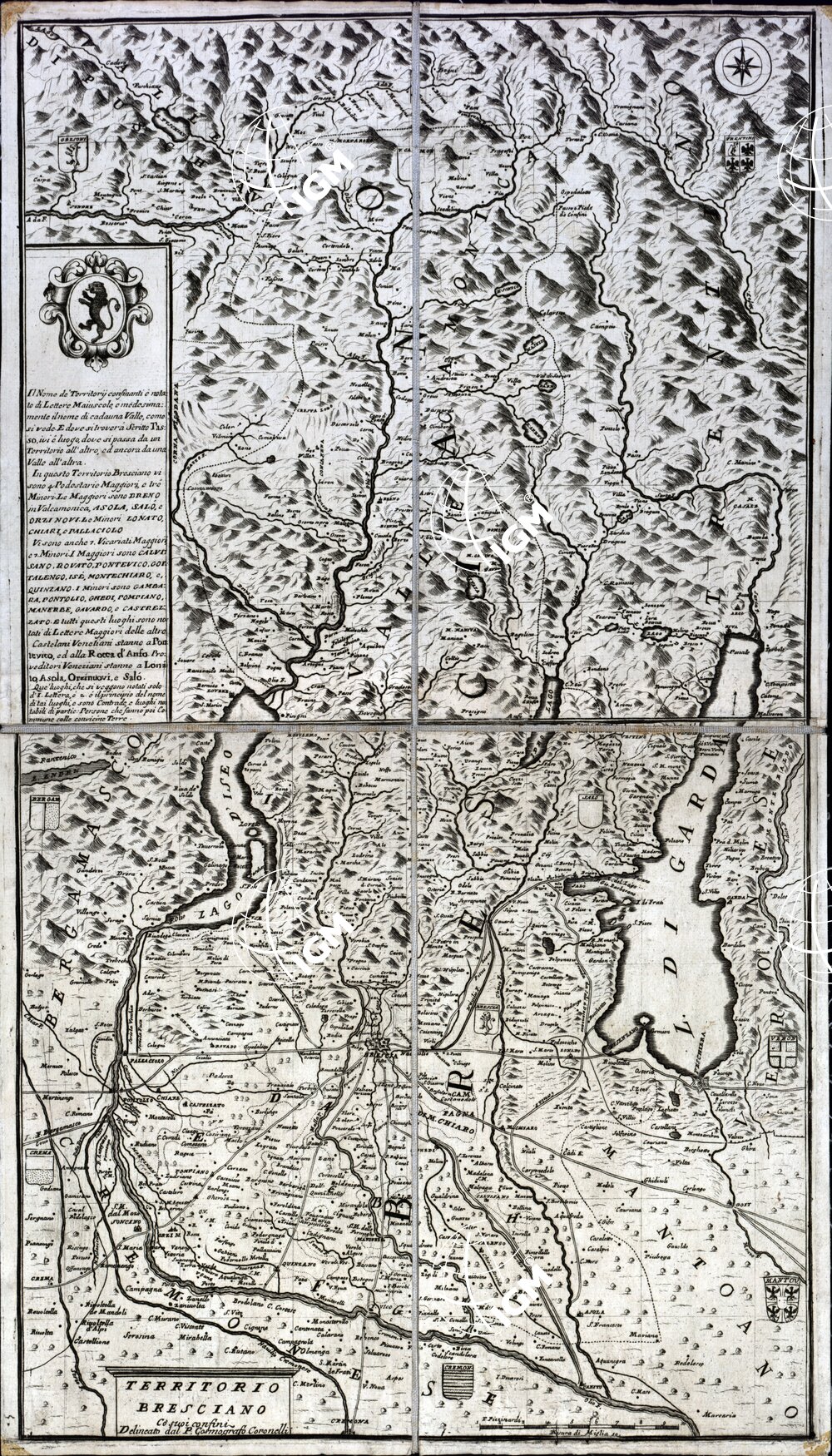 Due fogli incisi su rame riuniti e montati su tela a stacchi. Manca la graduazione marginale.