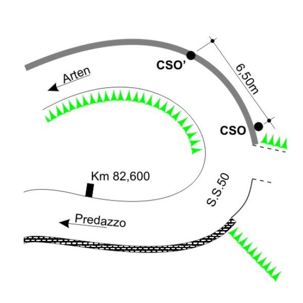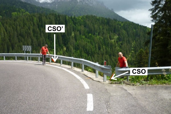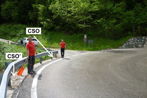 [{"simbolo_contrassegno":"B1","materializzazione":"(CSO) – Bullone infisso sul muro in cemento armato di contenimento a valle del tornante in corrispondenza della testa rivolta al passo."},{"simbolo_contrassegno":"B4","materializzazione":"(CSO') – Centrino universale infisso sulla sommit\u00e0 del muro suddetto a circa 6, 50 metri dal CSO. Coincidente con Punto Fiduciale n.353-PF.209."}]