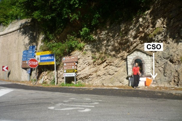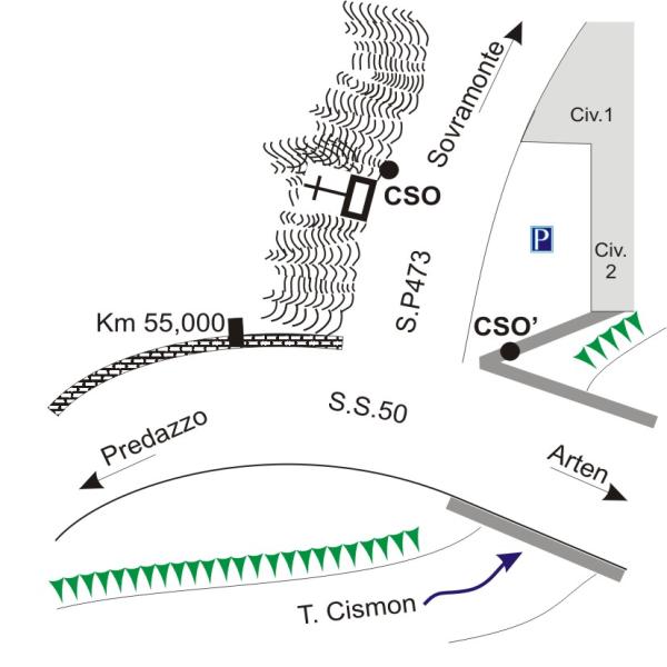 [{"simbolo_contrassegno":"B1","materializzazione":"(CSO) – Bullone infisso sulla roccia affiorante a destra del tabernacolo."},{"simbolo_contrassegno":"B4","materializzazione":"(CSO') – Centrino universale infisso sulla sommit\u00e0 del muraglione antistante il civico 2 in corrispondenza dell'estremit\u00e0 rivolta a Predazzo."}]