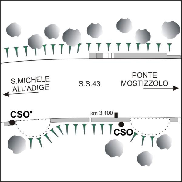 | Contrassegni | [{"simbolo_contrassegno":"B1","materializzazione":"(CSO) – Bullone infisso nel muro in cemento armato di contenimento di valle in corrispondenza della pietra chilometrica 3,100."},{"simbolo_contrassegno":"B4","materializzazione":"(CSO') – Centrino universale posto sulla sommit\u00e0 del muro a retta in cemento armato di valle nella testa rivolta a Ponte Mostizzolo a circa 50 metri dal CSO."}] |