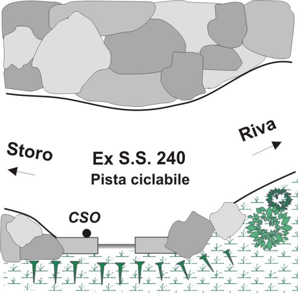 [{"simbolo_contrassegno":"B1","materializzazione":"(CSO) – Bullone infisso sul parapetto in sassi e cemento a fianco di un blocco di roccia."}]