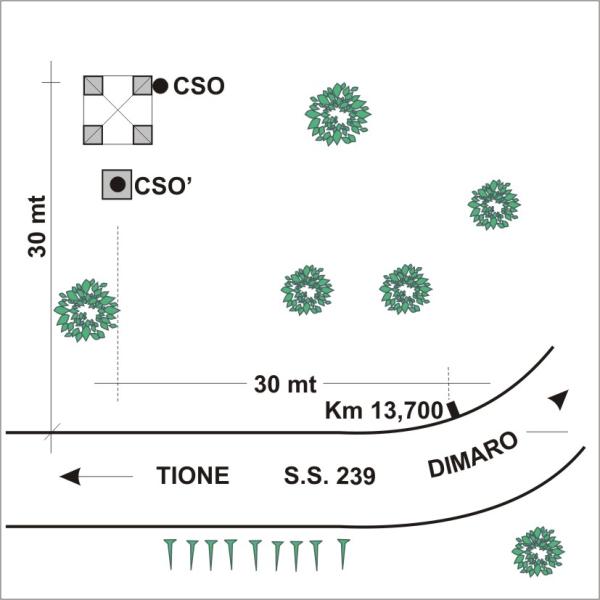 | Contrassegni | [{"simbolo_contrassegno":"B1","materializzazione":"(CSO) – Bullone infisso nel plinto di Nord-Est del traliccio dell'Enel a circa 30 metri della statale."},{"simbolo_contrassegno":"B7","materializzazione":"(CSO') – Centrino universale PAT \"con testa appiattita\" posto nelle immediate vicinanze del traliccio fissato alla sommit\u00e0 del plinto della vecchia linea elettrica."}] |