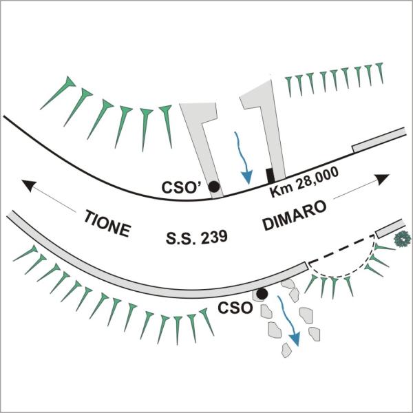 | Contrassegni | [{"simbolo_contrassegno":"B1","materializzazione":"(CSO) – Bullone infisso all'esterno del cordolo di sostegno del guard-rail in corrispondenza della spalla destra lato a valle del ponticello ."},{"simbolo_contrassegno":"B4","materializzazione":"(CSO') – Centrino universale infisso alla sommit\u00e0 del muro di valle della muraglia , prossimo alla strada ."}] |