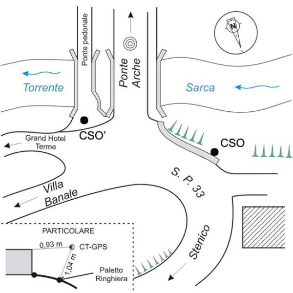 | Contrassegni | [{"simbolo_contrassegno":"B1","materializzazione":"(CSO) – Bullone infisso alla testa del marciapiede posto poco dopo il ponte sul Sarca lato Tione nel lato rivolto al torrente."},{"simbolo_contrassegno":"B6","materializzazione":"(CSO') – Centrino IGM95 \"tipo C\" infisso sul marciapiede rivestito di porfido del ponte pedonale a circa 90 cm dalla testa del parapetto di valle riva di sinistra."}] |