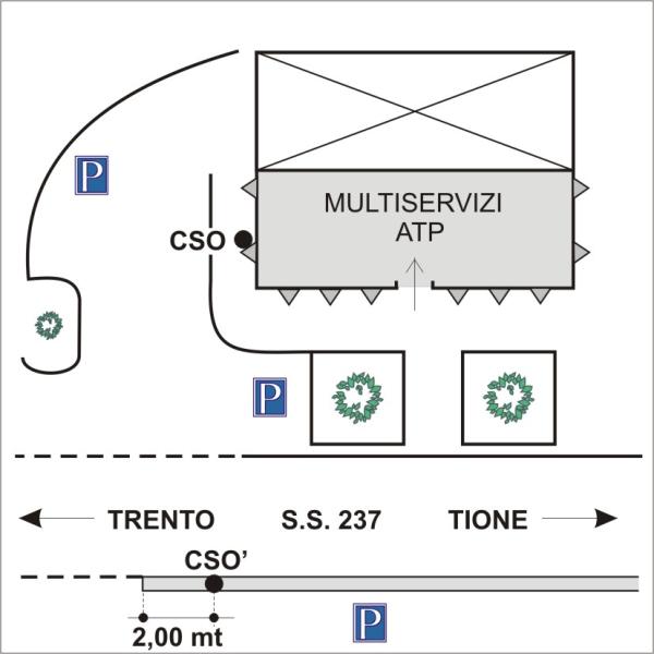 | Contrassegni | [{"simbolo_contrassegno":"B1","materializzazione":"(CSO) – Bullone infisso nel lato interno del pilastro in cemento armato a destra della facciata laterale rivolta a Trento dell'edificio Multiservizi."},{"simbolo_contrassegno":"B7","materializzazione":"(CSO') – Centrino Punto Fiduciale PAT infisso all'inizio del cordolo di cemento delimitante la S.S. posto all'altezza dell'edificio Multiservizi dellAzienda Turistica delle terme di Comiano."}] |