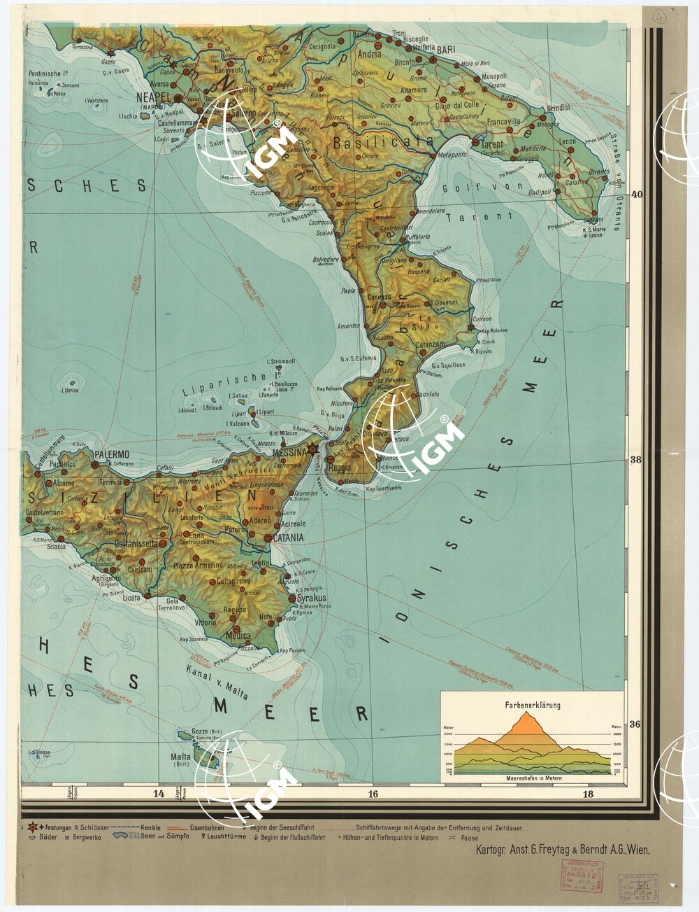 Autore Freytags & Nerndt.Luogo di edizione Vienna. Rappresentazione orografica a tinte ipsometriche.