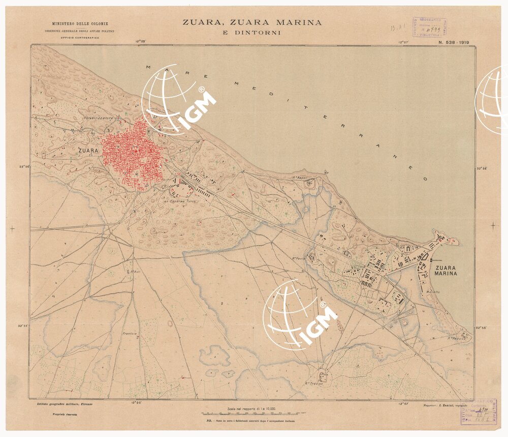 Un foglio a colori. Mappatore I. Zanini, topografo. Dimostrazione orografica in bistro, nomi e strade in nero, acque in azzurro, vegetazioni in verde, costruzioni in rosso. Sono distinti in nero i fabbricati costruiti dopo l’occupazione italiana.