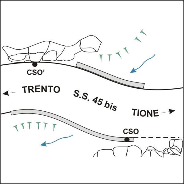 | Contrassegni | [{"simbolo_contrassegno":"B1","materializzazione":"(CSO) – Bullone PAT infisso nella roccia di fronte al Km 151,500."},{"simbolo_contrassegno":"B4","materializzazione":"(CSO') – Centrino universale infisso in corrispondenza della testata del muro di sostegno del guardrail lato Sarche , riva sinistra a valle."}] |