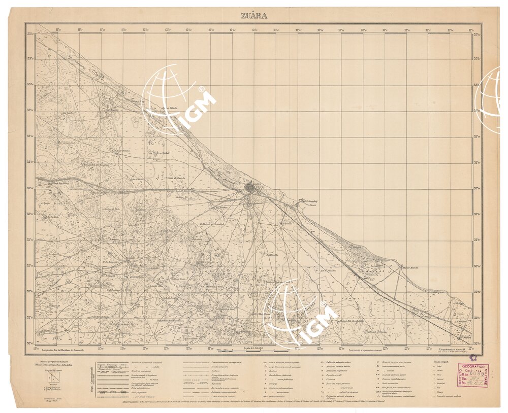 I.G.M. UFFICIO TOPOCARTOGRAFICO DELLA LIBIA. Carta con curve di livello, tipo di stampa in nero, grafia in lingua italiana; nella parte inferiore Segni Convenzionali.