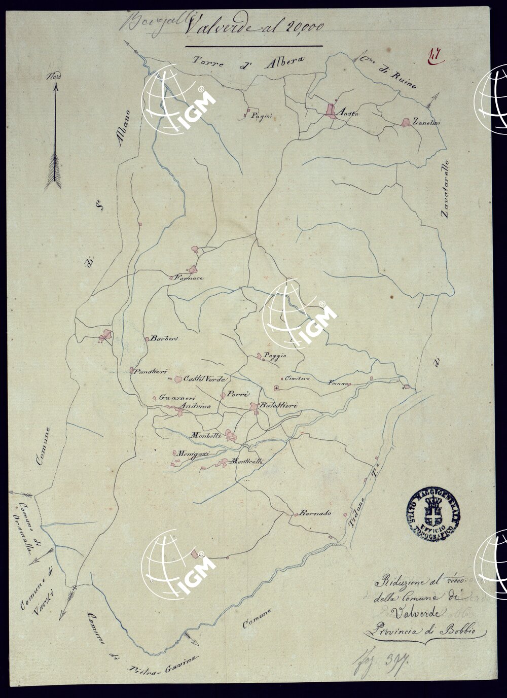 Gruppo di 51 mappe catastali di diversi comuni, impiegate con tutta probabilità per la costruzione della carta generale degli Stati Sardi al 50.000. Senza firma, eccetto due, firmate da lagrange, una riduzione del piano catastale del territorio d’Ivrea firmato Valsecchi 1822, e una riproduzione dei piani catastali di comuni della provincia d’Ivrea firmata Cap. Roggero.