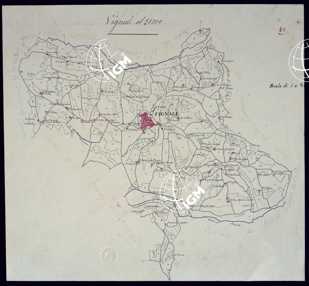 Gruppo di 51 mappe catastali di diversi comuni, impiegate con tutta probailità per la costruzione della carta generale degli Stati Sardi al 50.000. Senza firma, eccetto due, firmate da lagrange, una riduzione del piano catastale del territorio d’Ivrea firmato Valsecchi 1822, e una riproduzione dei piani catastali di comuni della provincia d’Ivrea firmata Cap. Roggero.