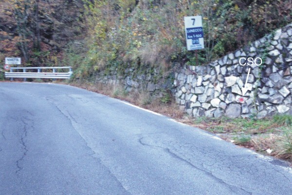 | Contrassegni | [{"simbolo_contrassegno":"B1","materializzazione":"(CSO) – Bullone infisso alla base di un muro in pietra di contenimento di una rampa di accesso."}] |