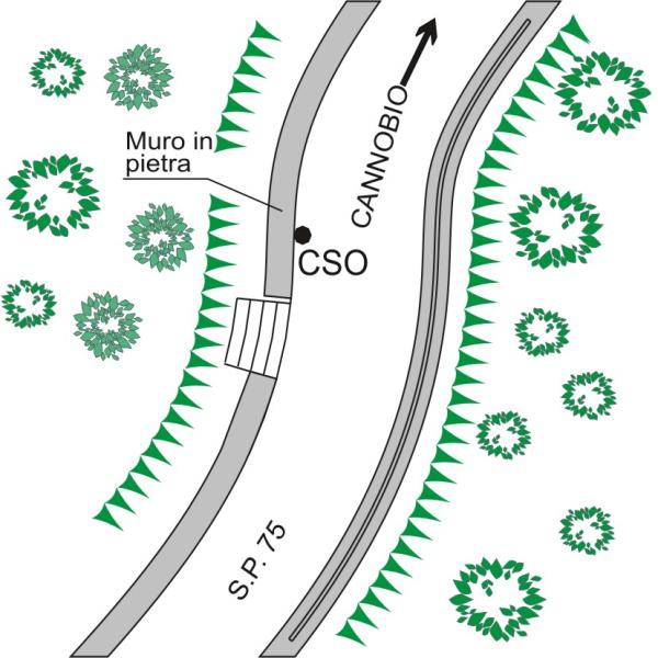 | Contrassegni | [{"simbolo_contrassegno":"B1","materializzazione":"(CSO) – Bullone infisso alla base di un muro in pietra, lato valle, di una stradina di accesso ad una casa."}] |