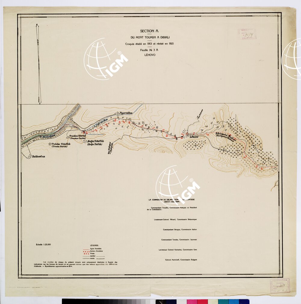 Autore Commissione Confini. Rappresentazione orografica a curve di livello. Editore Imprimerie D’ Etat – Luogo di edizione Sofia. Grafia francese locale. Tipologia policroma.