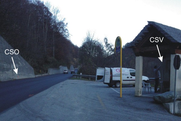 | Contrassegni | [{"simbolo_contrassegno":"B1","materializzazione":"(CSO) – Bullone infisso nel muro di contenimento, in corrispondenza del Km 10+800."},{"simbolo_contrassegno":"V6","materializzazione":"(CSV) – Piastrina con cilindretto infissa sulla spigolo sinistro della pensilina in legno della fermata degli autobus."}] |