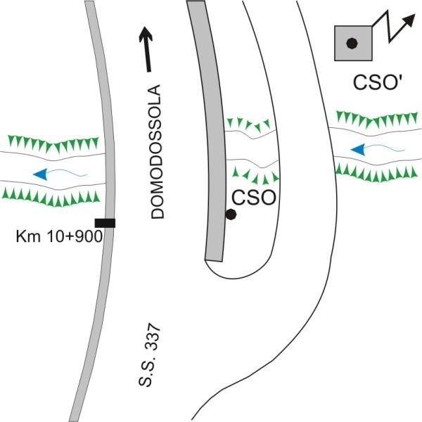 | Contrassegni | [{"simbolo_contrassegno":"B1","materializzazione":"(CSO) – Bullone infisso nel muro di contenimento della sede stradale in prossimit\u00e0 dell'imbocco di una stradina, direzione Masera."},{"simbolo_contrassegno":"B7","materializzazione":"(CSO') -Centrino metallico della regione Piemonte ubicato sulla soletta in calcestruzzo del casottino Enel."}] |