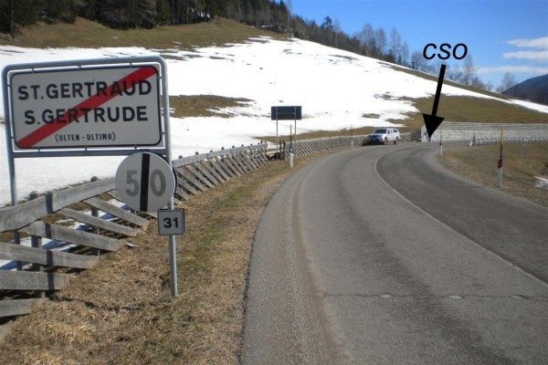 | Contrassegni | [{"simbolo_contrassegno":"B1","materializzazione":"(CSO) – Bullone infisso nel muro di sostegno a monte, in pietre naturali, direzione San Gertrude."}] |