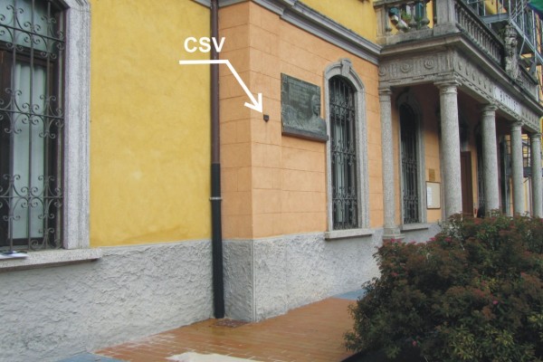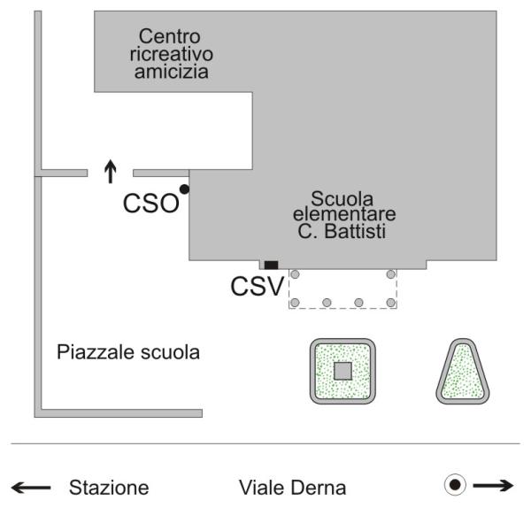 [{"simbolo_contrassegno":"B1","materializzazione":"(CSO) – Bullone infisso sul muretto del cancello d'ingresso al centro ricreativo, in prossimit\u00e0 dello spigolo sud-ovest delle scuole elementari \"C. Battisti\"."},{"simbolo_contrassegno":"V1","materializzazione":"(CSV) – Mensola infissa sulla facciata principale delle scuole elementari \"C. Battisti\", in prossimit\u00e0 dello spigolo di sinistra dell'avancorpo."}]