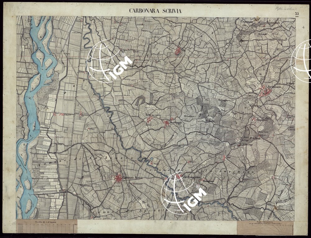 Gruppo di 55 tavolette rilevate da ufficiali dello Stato Maggiore. Quarantacinque di esse sono formate dalla riunione di rilievi parziali e ridisegnate in ufficio; undici sono rilievi originali di campagna. Alcune sono aggiornate al 1885 in base a nuove ricognizioni ed alle levate al 25.000: Ciascuna reca la firma degli operatori e dei revisori. Esse rappresentano l’orografia a curve di livello tracciate alla equidistanza di 5 m.; abitati in rosso, acque in azzurro, rimanente della planimetria e toponomastica in nero. Fogli montati su tela.