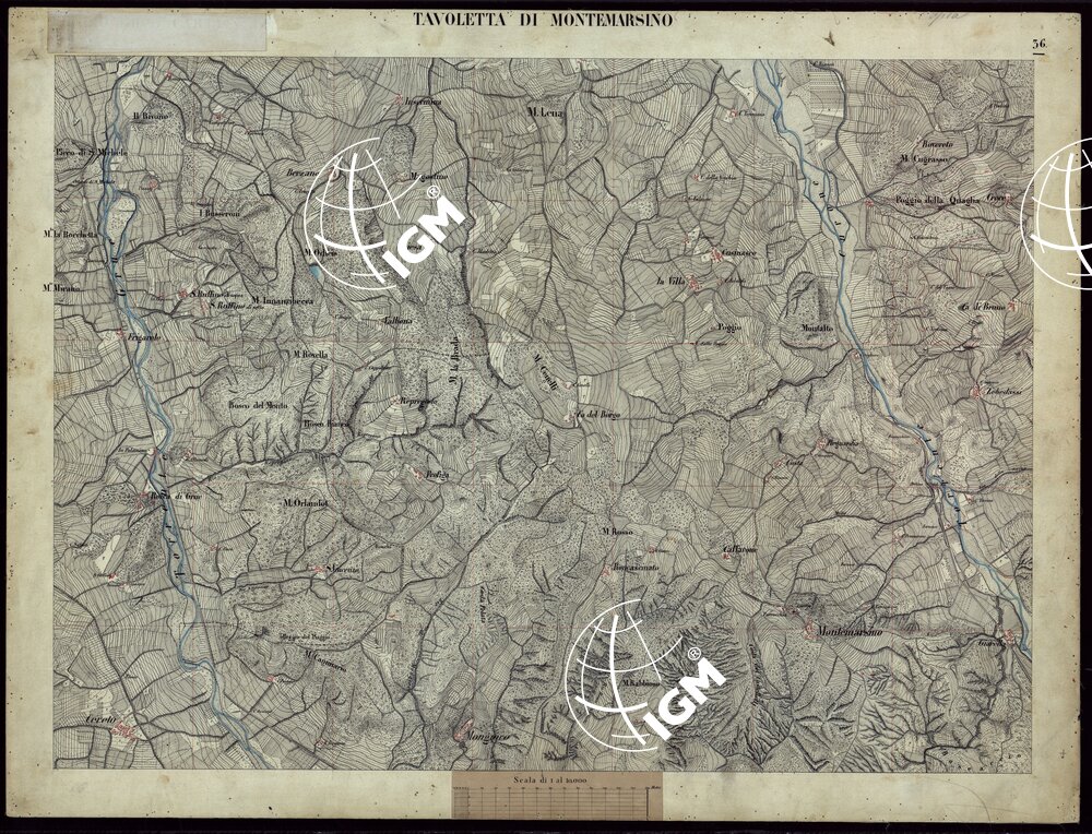 Gruppo di 55 tavolette rilevate da ufficiali dello Stato Maggiore. Quarantacinque di esse sono formate dall riunione di rilievi parziali e ridisegnate in ufficio; undici sono rilievi originali di campagna. Alcune sono aggiornate al 1885 in base a nuove ricognizioni ed alle levate al 25.000. Ciascuna reca la firma degli operatori e dei revisori. Esse rappresentano l’ororgrafia a curve di livello tracciate alla equidistanza di 5 m.; abitati in rosso, acque in azzurro, rimanente della planimetria e toponomastica in nero. Fogli montati su tela.