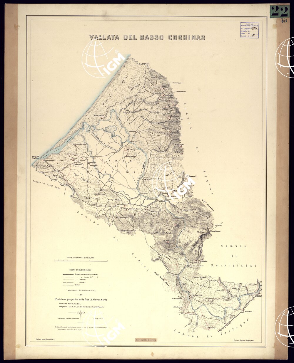 Un foglio disegnato a penna. Eccellente originale del Cap. Stragapede a curve di livello tracciate alla equidistanza di 5 m.
