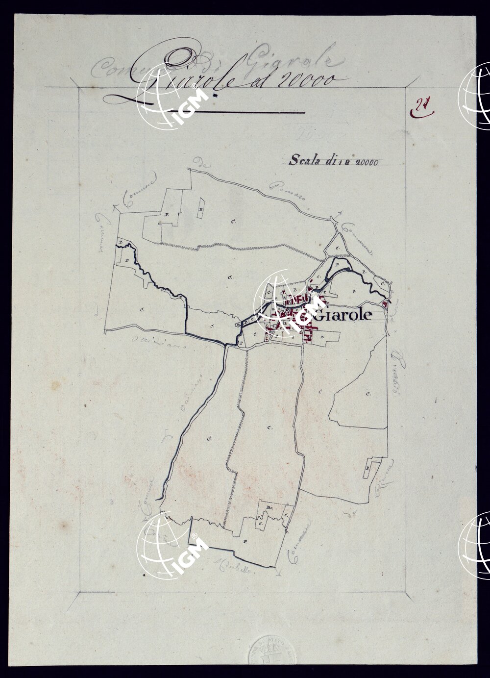 Il titolo non è presente sulla carta. Gruppo di 51 mappe catastali di diversi comuni, impiegate con tutta probabilità per la costruzione della carta generale degli Stati Sardi al 50.000. Senza firma, eccetto due, firmate da Lagrange, una riduzione del piano catastaloe del territorio d’Ivrea firmato Valsecchi 1822, e una riproduzione dei piani catastali di comuni della provincia d’Ivrea firmata Cap. Roggero.