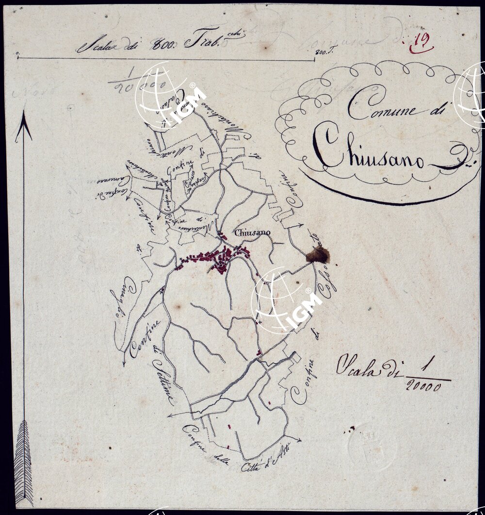 Il titolo non è presente sulla carta. Gruppo di 51 mappe catastali di diversi comuni, impiegate con tutta probabilità per la costruzione della carta generale degli Stati Sardi al 50.000. Senza firma, eccetto due, firmate da Lagrange, una riduzione del piano catastale del territorio d’Ivrea firmato Valsecchi 1822, e una riproduzione dei piani catastali di comuni della provincia d’Ivrea firmata Cap. Roggero.