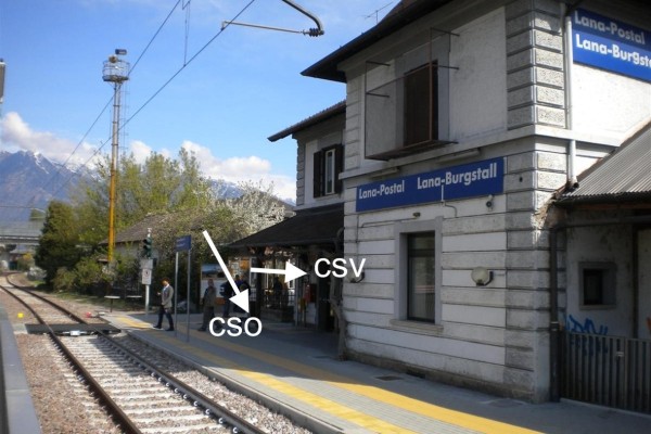 | Contrassegni | [{"simbolo_contrassegno":"B1","materializzazione":"(CSO) – Bullone infisso nel muro in cemento armato, lato verso i binari, a sinistra della facciata della stazione ferroviaria."},{"simbolo_contrassegno":"V3","materializzazione":"(CSV) – Piastrina antica austriaca infissa nella facciata, volta verso i binari, dell'edificio principale della stazione ferroviaria, in prossimit\u00e0 dello spigolo sinistro."},{"simbolo_contrassegno":"V4","materializzazione":"(CSV') – Piastrina del Magistrato alle Acque, infissa nella facciata, volta verso i binari, dell'edificio principale della stazione ferroviaria, a destra del CSV."}] |